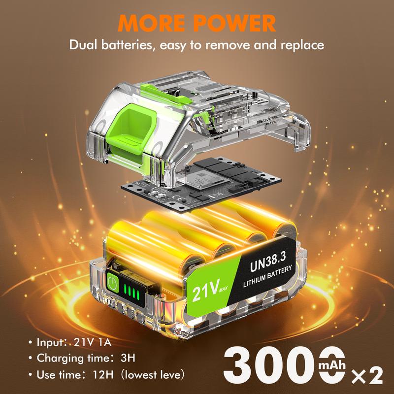 2x 21V 3.0Ah batteries + fast charger (red=charging, green=full); 20-25 mins high-speed runtime (10 mins/battery) for easier yard work.
